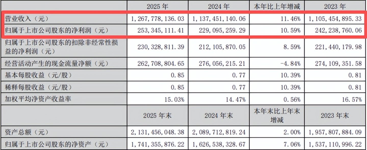 数据不差,甚至可以说稳健。2023 年至 2025 年,营收呈稳步增长态势,净利润在 2024 年略有下滑后,2025 年恢复增长。