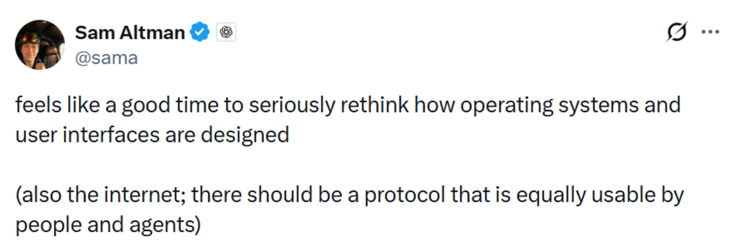 「现在似乎是时候认真重新思考操作系统和用户界面的设计方式了 (互联网也是如此;应该有一个对人和 agent 都同样适用的协议)」。