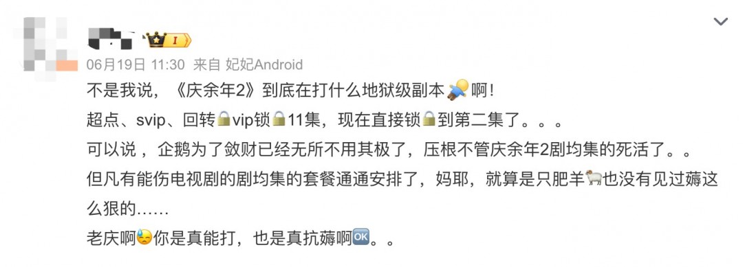 此外,《庆余年 2》 提前锁 V 也引发热议。一般来说,正在热播的剧集,非 VIP 更新到最后还剩 7 集或 9 集的时候就不再更新了,需要开会员才能继续看,而 《庆余年 2》 直接锁了最后 11 集,比其他剧集都多,再加上超点,有网友感慨,「就算是只肥羊,也没见过薅这么狠的」。