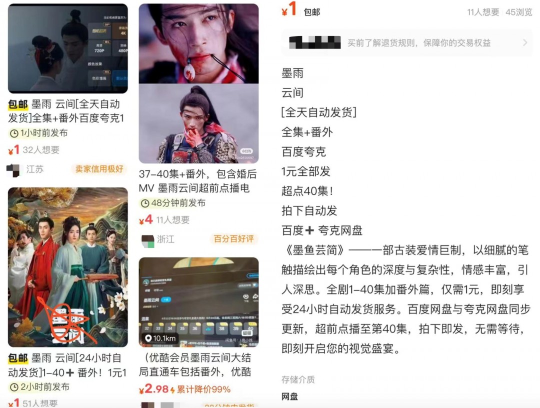 上周末,《墨雨云间》 超前点播大结局,开播后仅 5 分钟,其盗版资源已在多个平台被售卖,1 元即可看全集加番外高清资源,正版提前解锁最后四集需要 24 元。而在一些盗版网站上,甚至可以免费看到该剧全集资源。