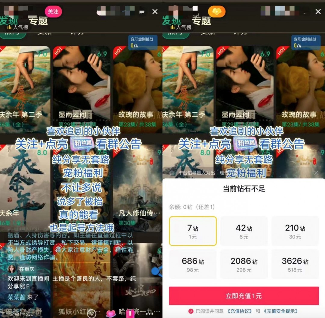 在短视频平台,有人直播售卖盗版资源的网址。这些直播间通常以低价、热播剧集资源等为噱头,引导用户关注主播,点亮粉丝团,付费 1 元入群,群内提供盗版网站的下载网址。