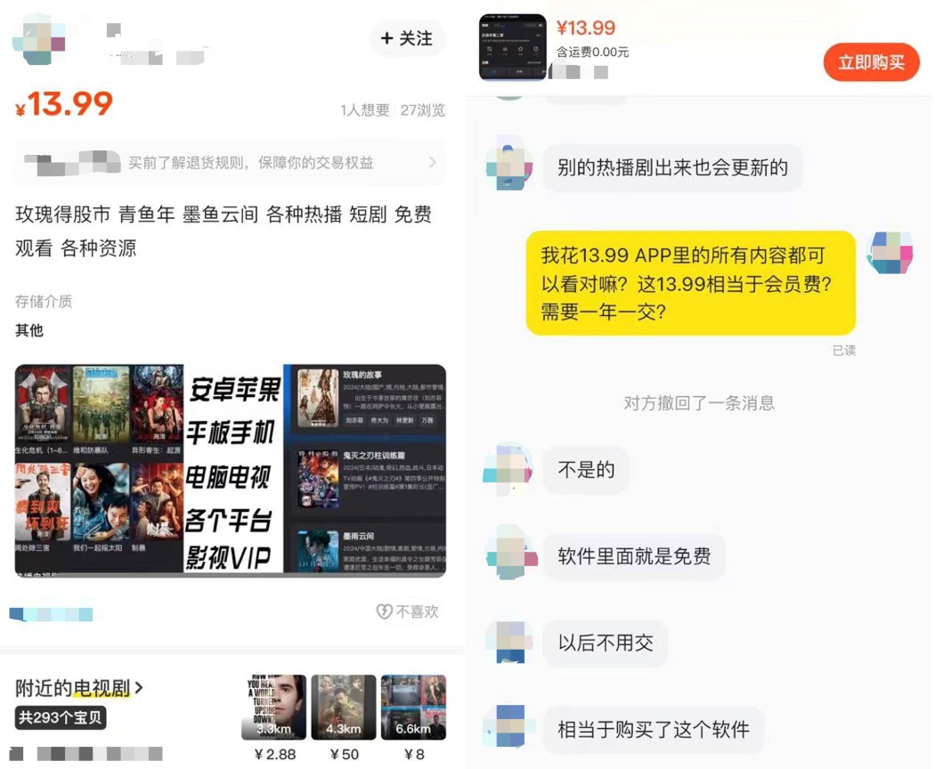 此外,在二手平台,还有人售卖盗版资源 APP,支付 13.99 元便可观看各个平台的影视 VIP 内容,包括院线电影、热播剧、短剧等,支持安卓苹果平板、手机,以及电脑、电视登陆,并声称可永久使用。