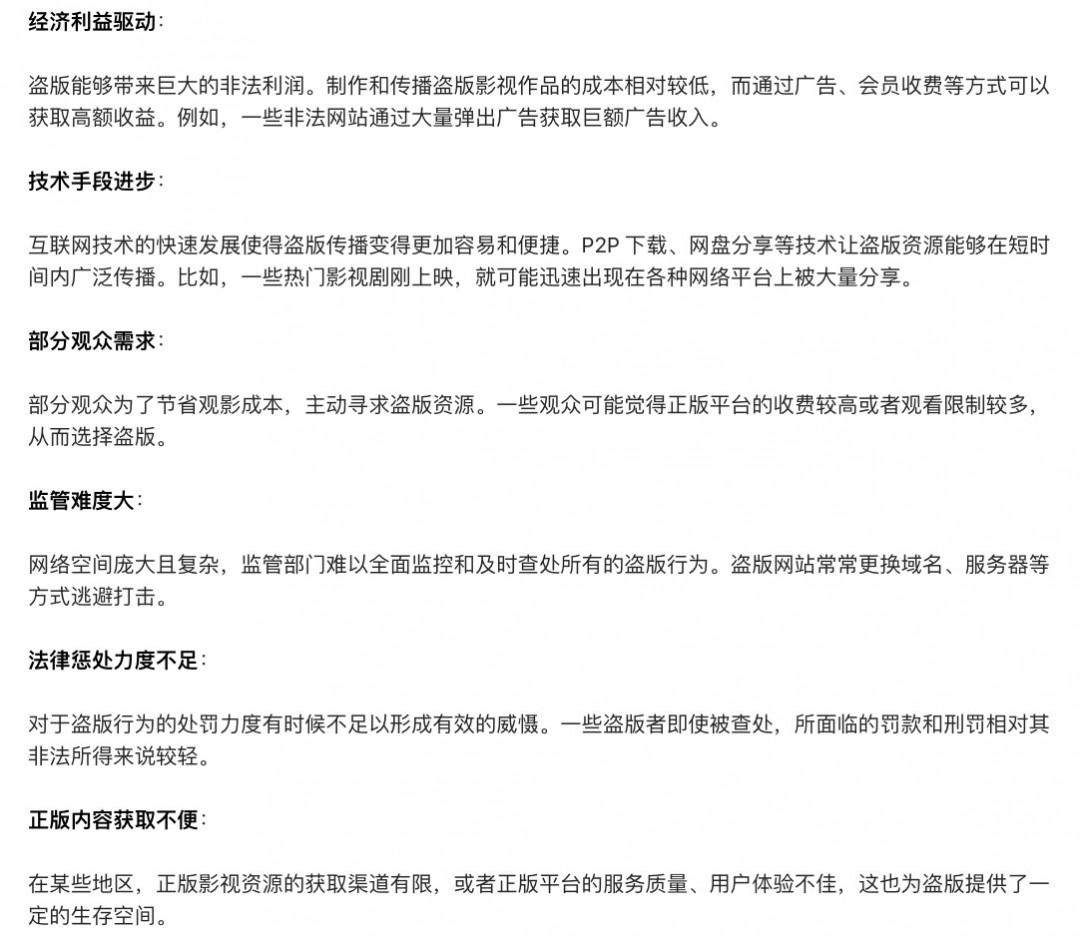 视频平台苦盗版久矣,能做的却很有限。对于影视盗版屡禁不止的原因,AI 大模型豆包给出了 6 点分析: