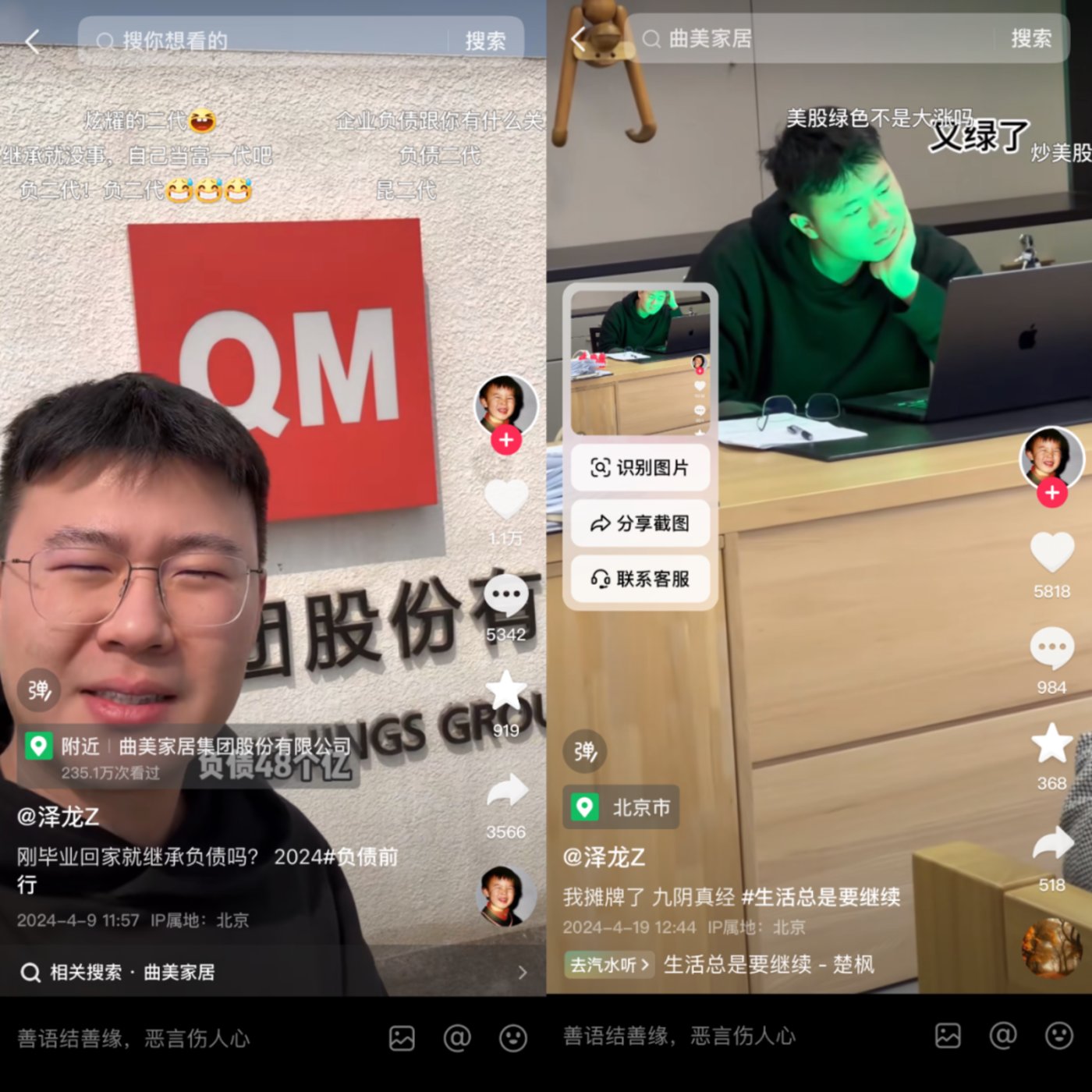 截至目前,@曲美家居集团官方账号 抖音粉丝量仅 10.2 万,做了五年多时间不及赵泽龙做了两个月。「曲美家居集团官方账号」 评论区里,不乏 「太子爷视频来的」、「你我本无缘,全靠父债子还」 等评论。