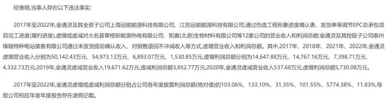 江苏证监局去年 12 月发布的行政处罚决定书显示,2017 年至 2022 年,金通灵虚增或虚减利润总额分别占公司各年度披露利润总额 (绝对值) 的 103.06%、133.10%、31.35%、101.55%、5774.38%、11.83%,导致公司相应年度的年度报告存在虚假记载。