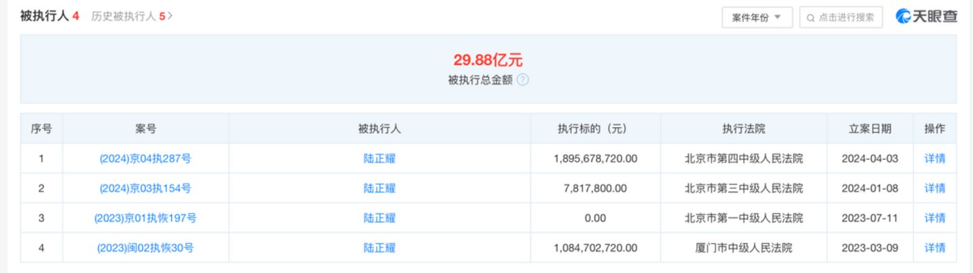 不得不说,当年陆正耀做瑞幸的时候还是很有眼光的,瑞幸教育了第一波市场,获客成本很低。可惜的是,天眼查 APP 显示,如今陆正耀被列为债务被执行人,被执行金额仍然高达 29.88 亿。